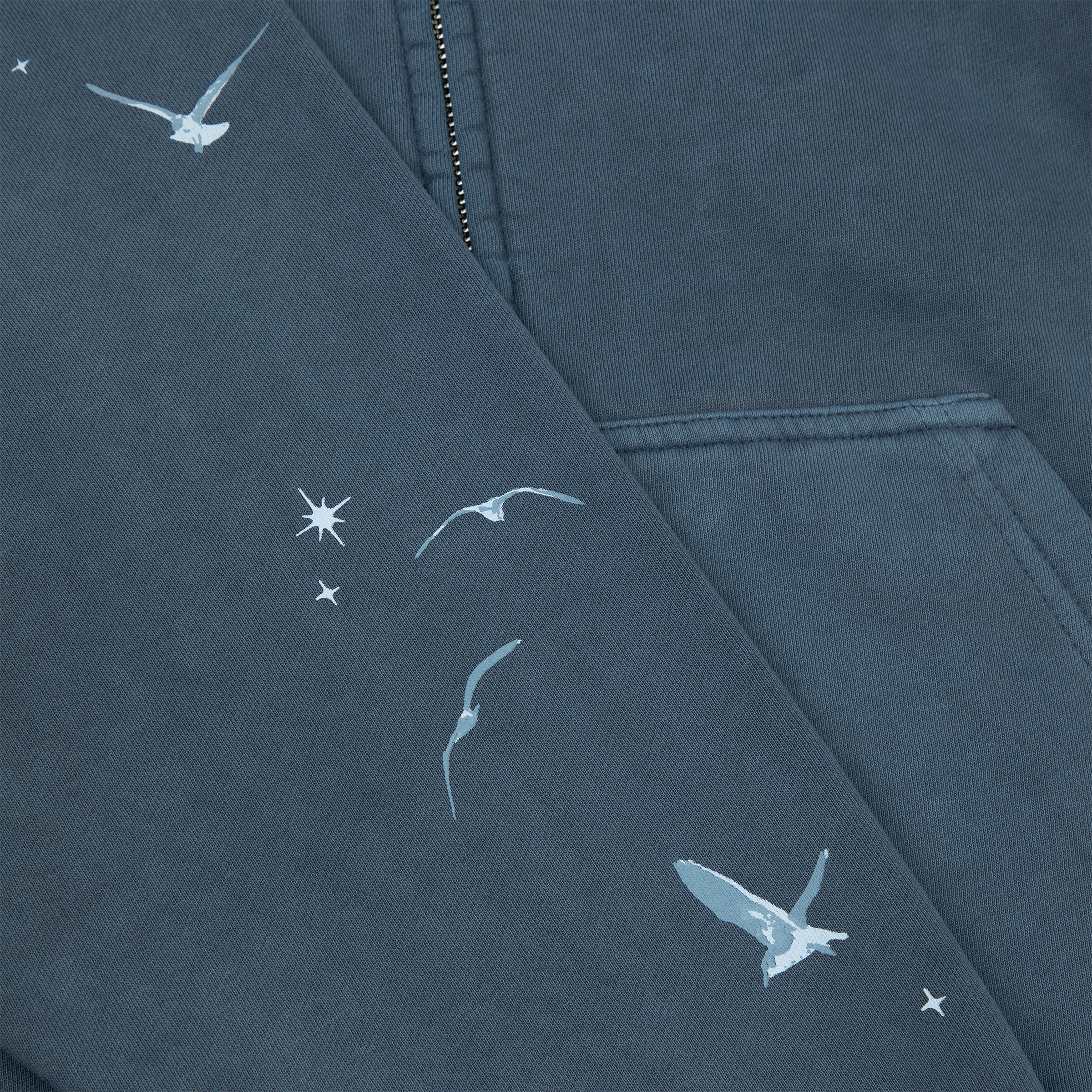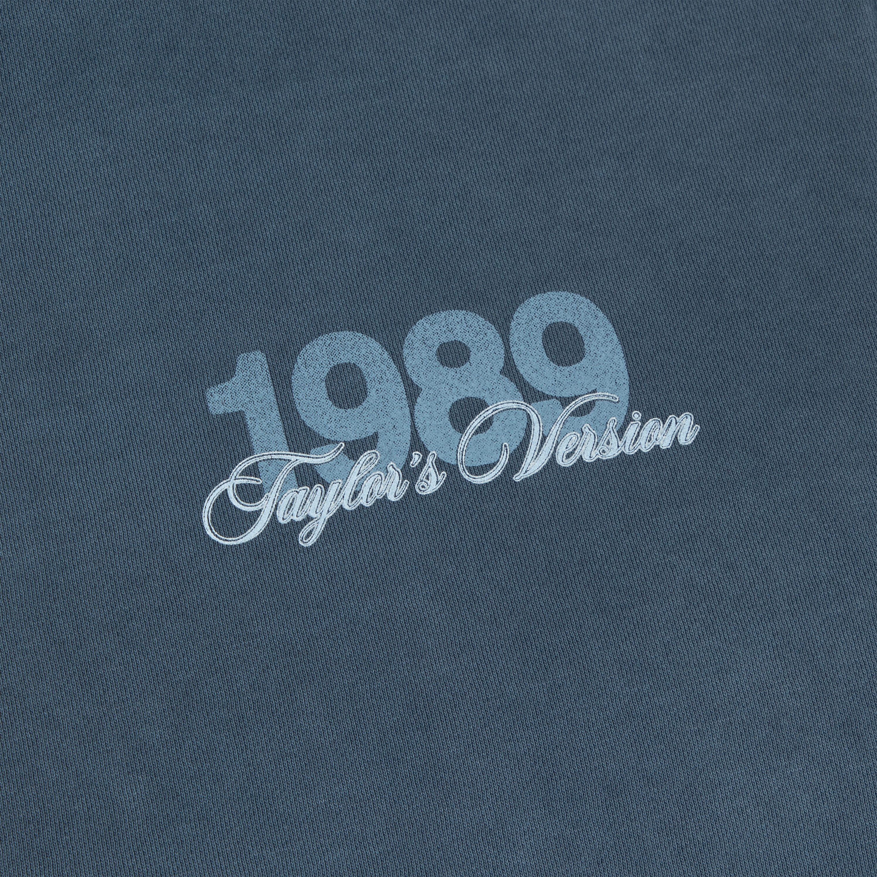 Washed blue zip up drawstring hoodie with front pockets featuring 1989 Taylor’s Version album title printed on wearer’s front left chest with seagull design printed down wearer’s right arm and Is It Over Now? song lyrics and Taylor Swift with seagull design printed on back.