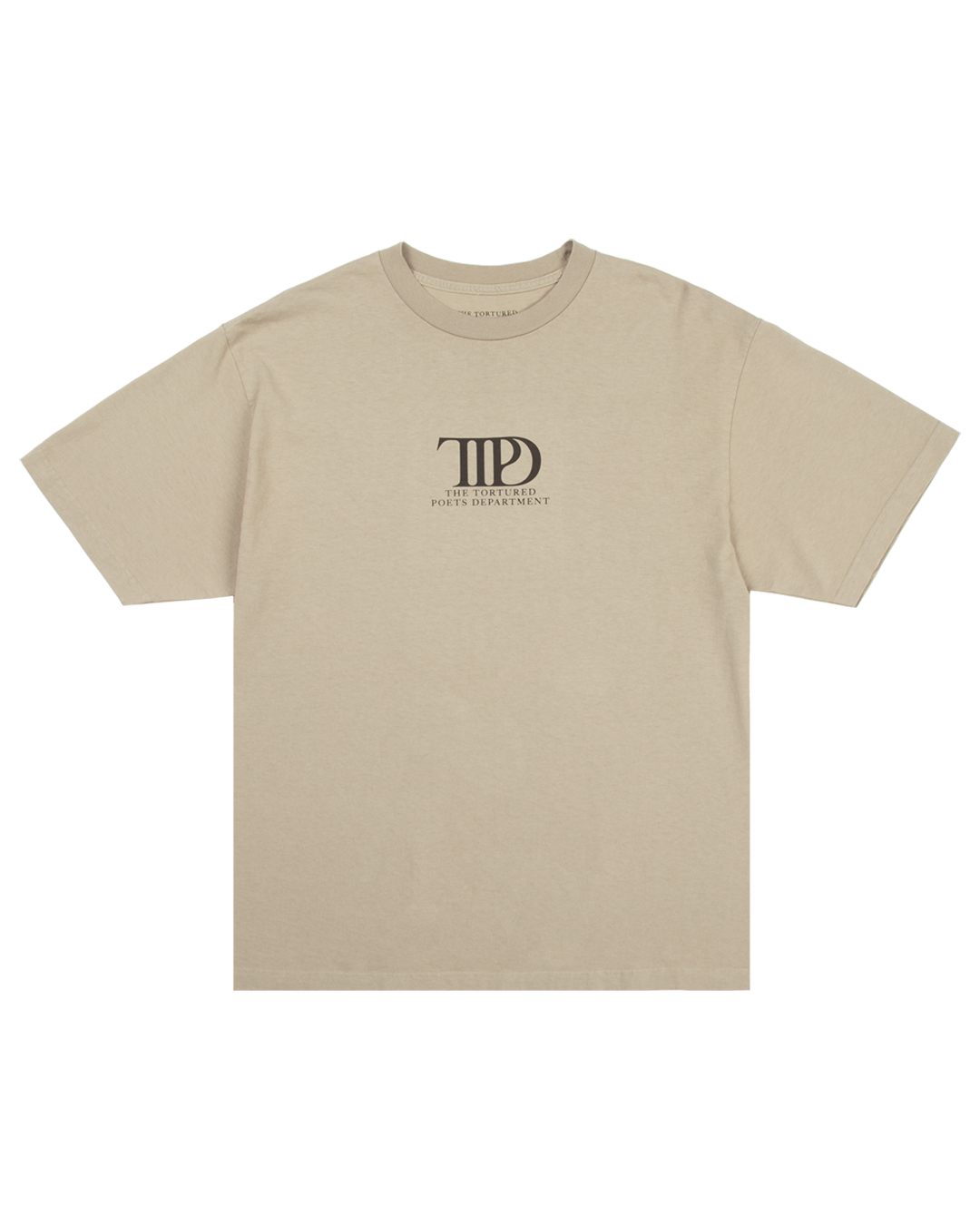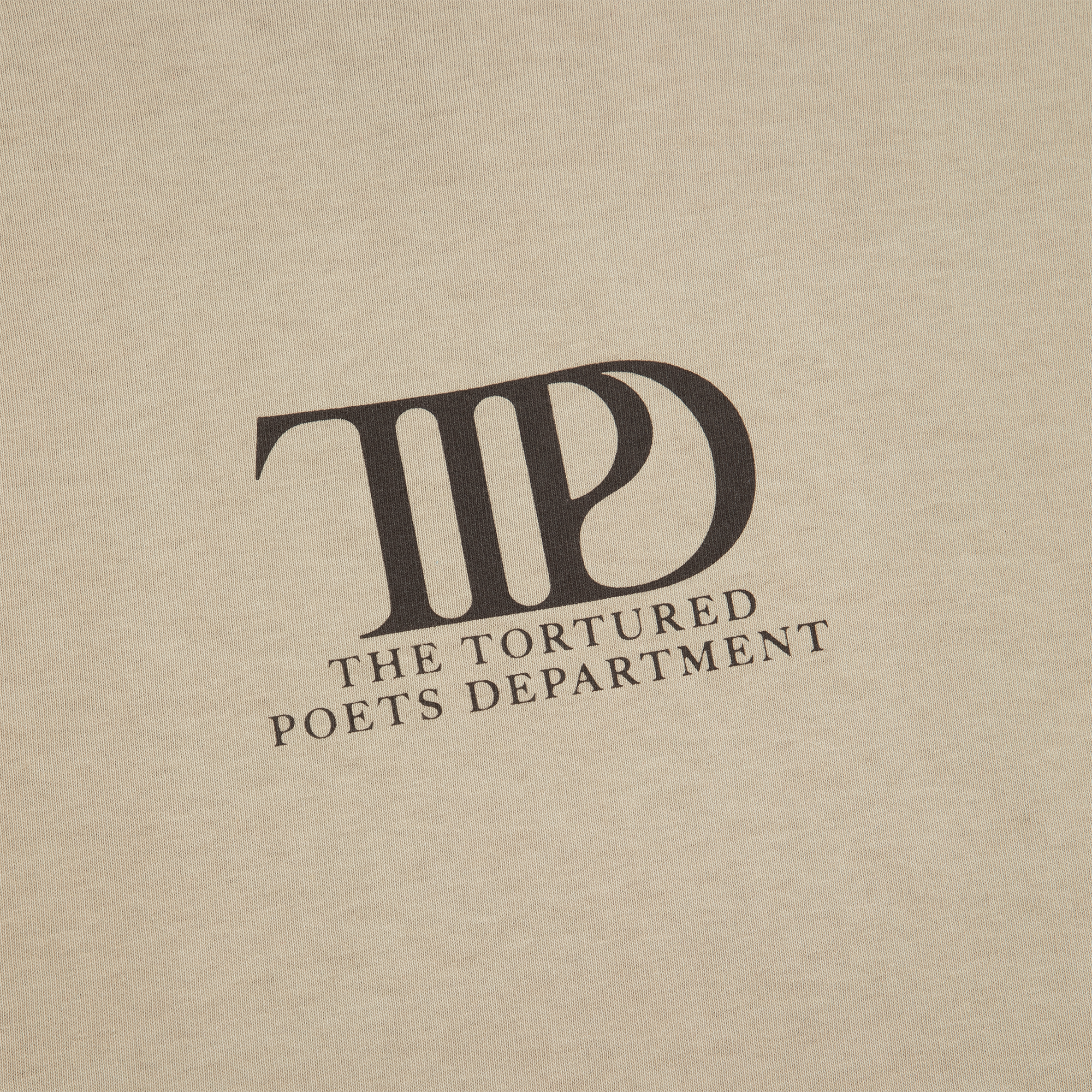 Taupe t-shirt featuring TTPD album logo and The Tortured Poets Department printed on wearer’s chest with cyclone design. I Chose This Cyclone With You song lyrics. and The Tortured Poets Department printed on back.