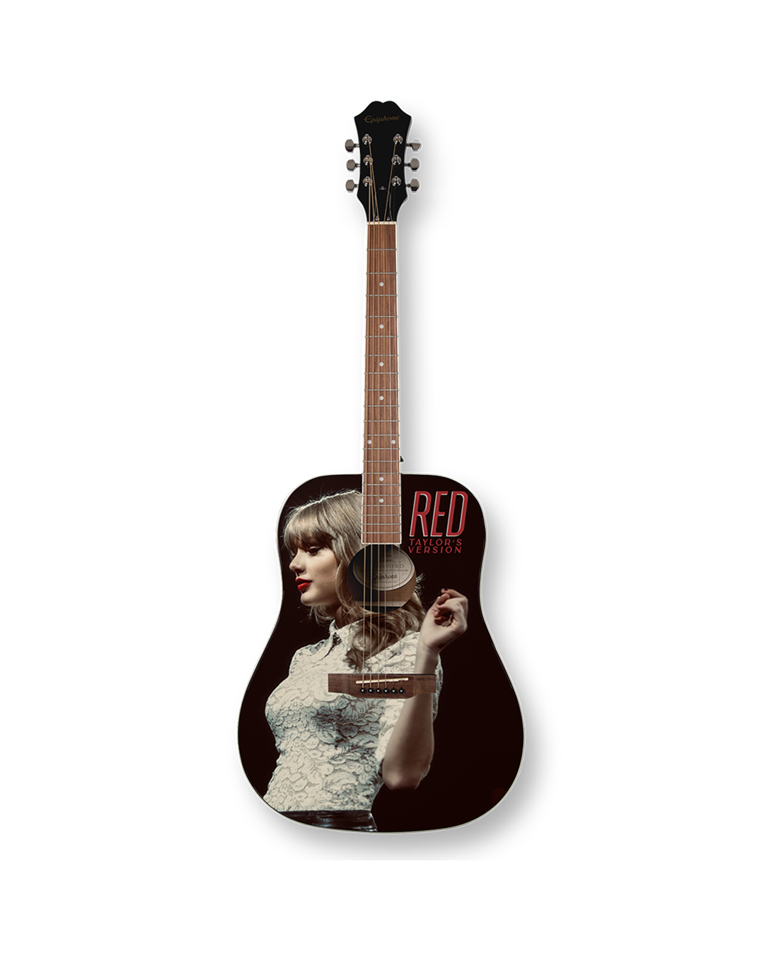 Acoustic Epiphone DR-100 guitar with custom-designed Red (Taylor’s Version) album photo of Taylor Swift and Red Taylor’s Version printed on front. Each guitar comes with a unique serial number printed on the back of the guitar headstock to identify this collectible product.