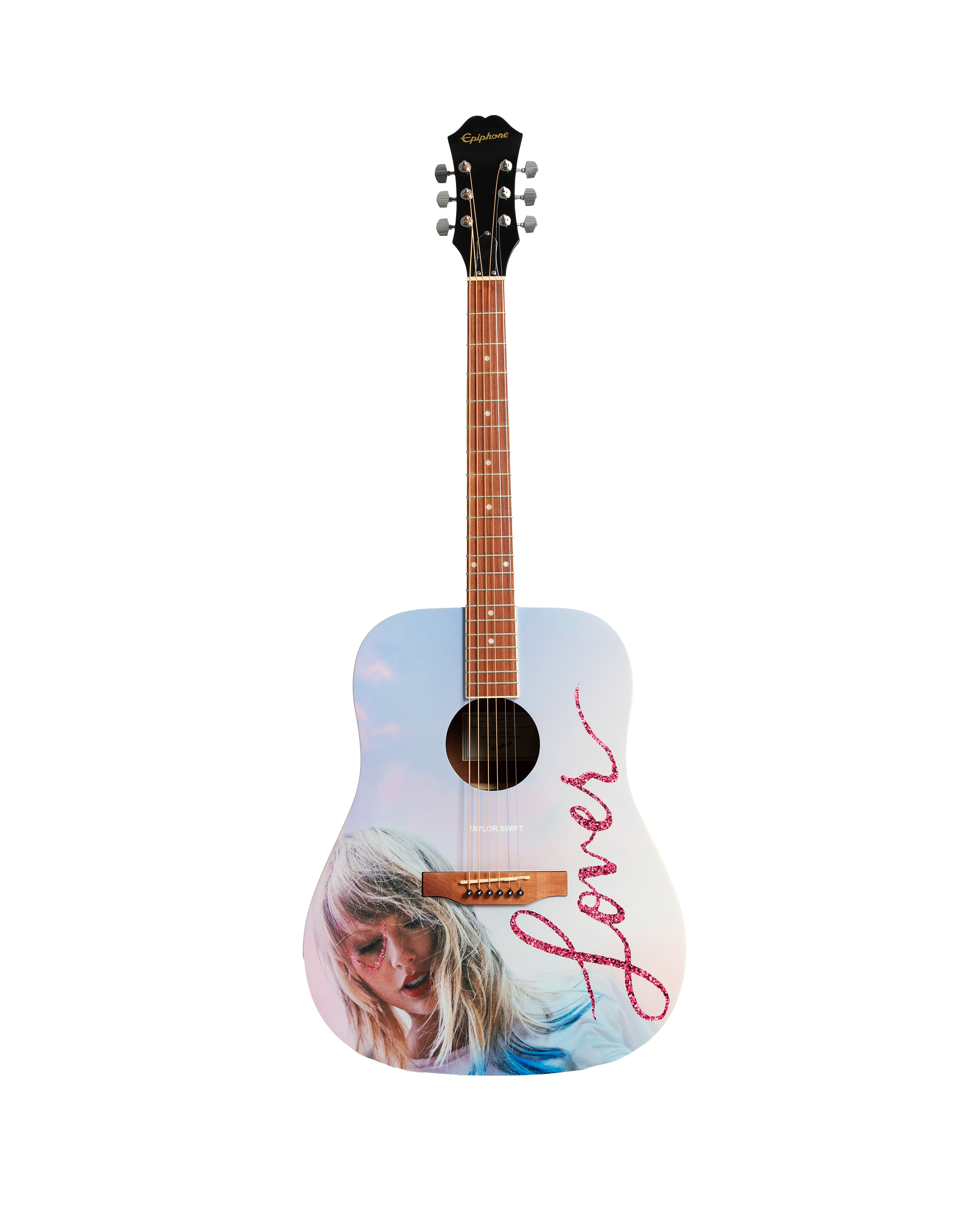 Acoustic Epiphone DR-100 guitar with custom-designed Taylor Swift Lover album photo of Taylor Swift and Taylor Swift Lover printed on front. Each guitar comes with a unique serial number printed on the back of the guitar headstock to identify this collectible product.