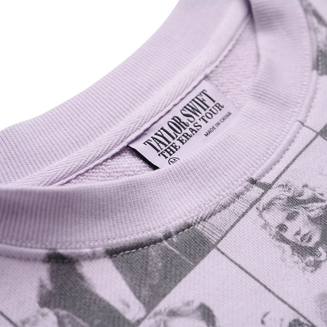 Lavender cropped crewneck featuring an all over print of photos of Taylor Swift.