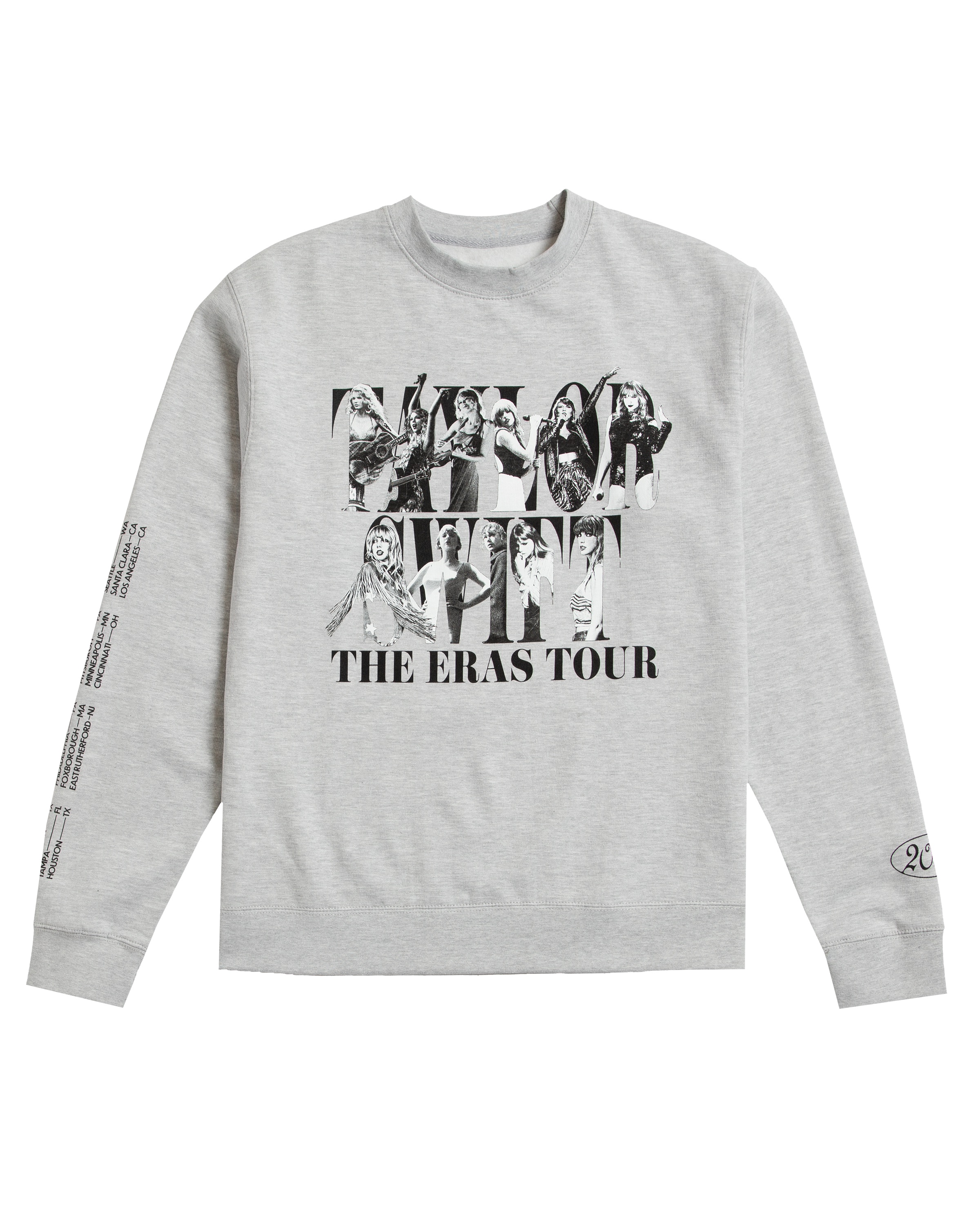 Gray crewneck with illustrations of Taylor Swift and Taylor Swift | The Eras Tour printed on front with tour locations printed on wearer’s right arm and 2023 printed on wearer’s left arm.