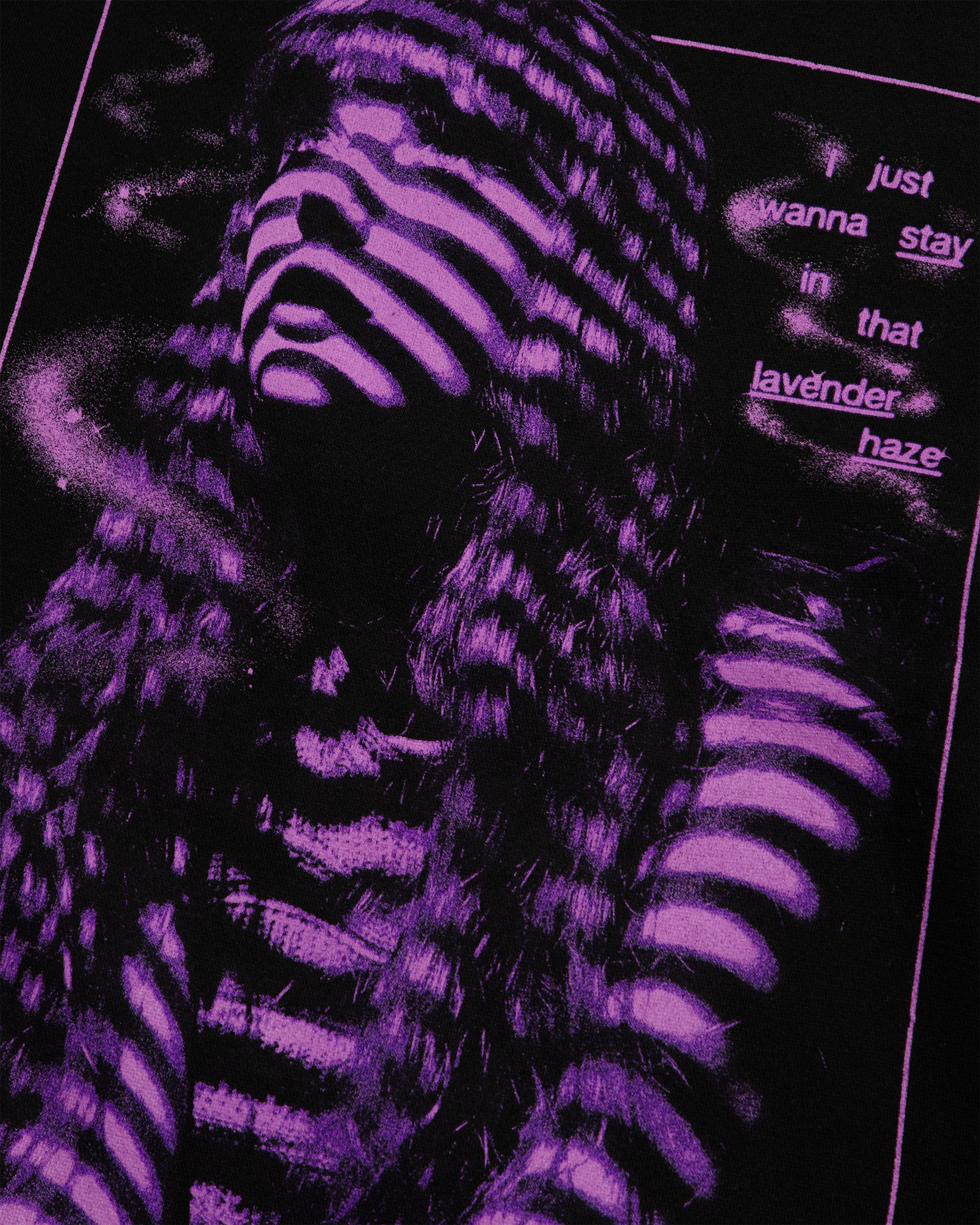 Black crewneck featuring photo of Taylor Swift with I just want to stay in that lavender haze song lyrics and Taylor Swift printed on front.