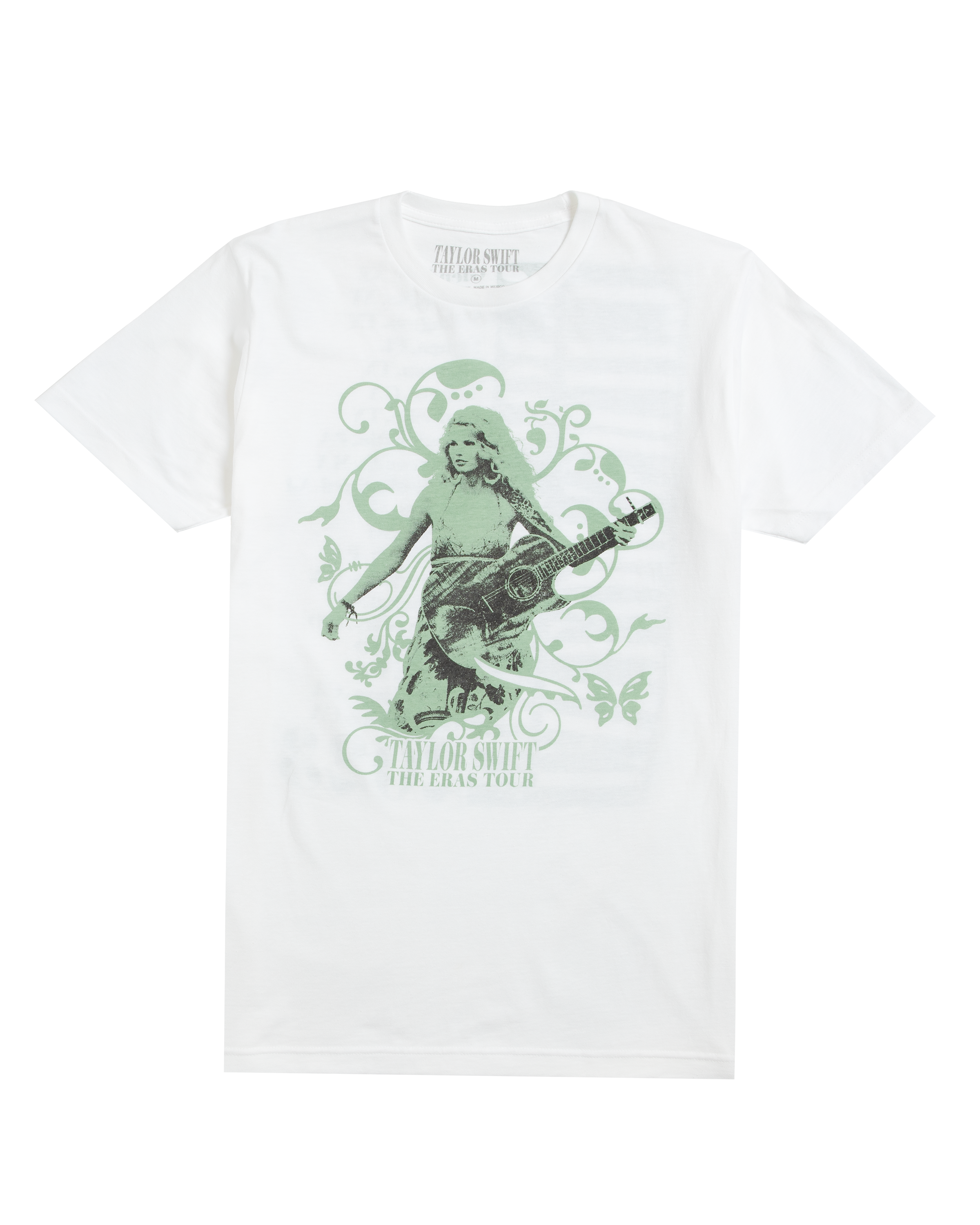White t-shirt with self-titled album era photo of Taylor Swift and Taylor Swift | The Eras Tour printed on front and Taylor Swift | The Eras Tour. tour locations. and 2023 printed on back.