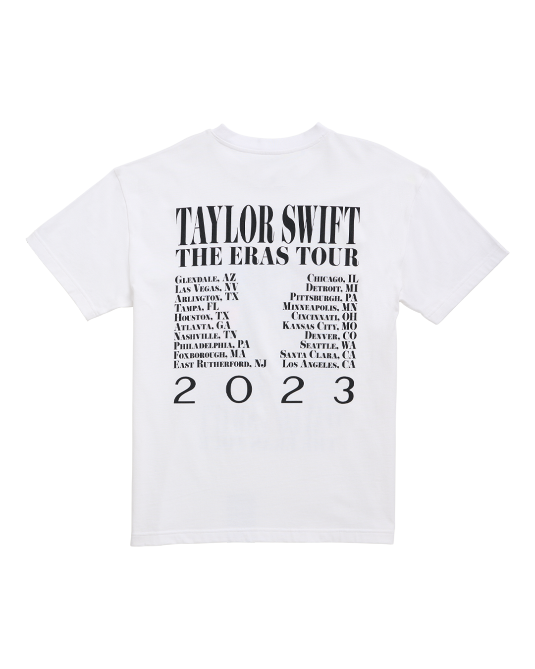 White t-shirt featuring Taylor Swift | The Eras Tour and photos of Taylor Swift printed on front with Taylor Swift | The Eras Tour. United States tour locations. and 2023 printed on back.