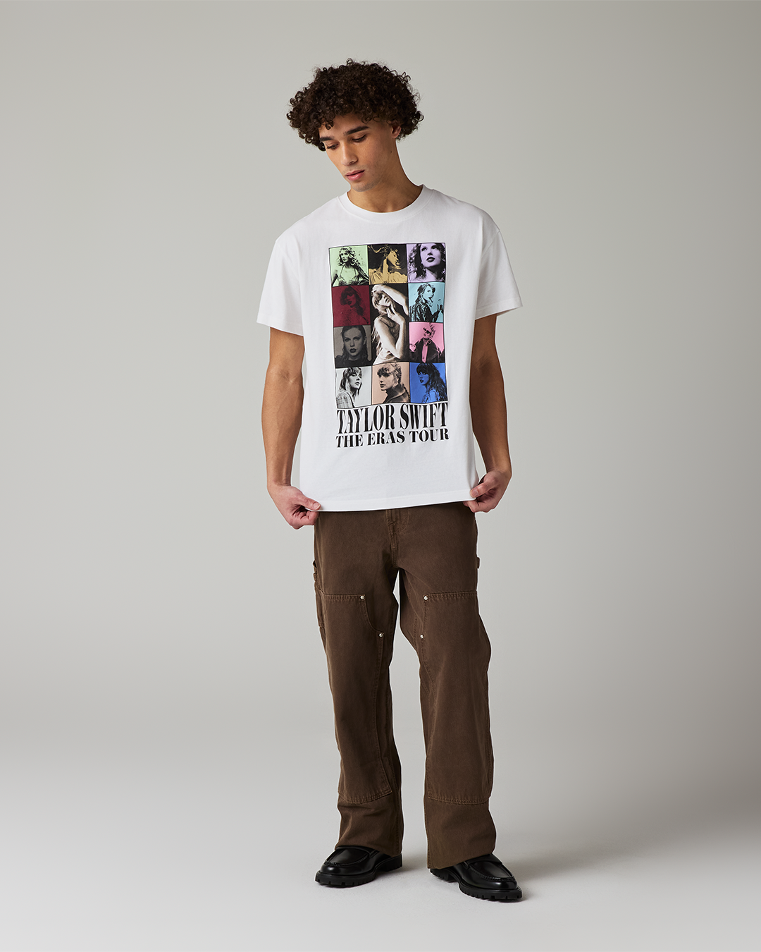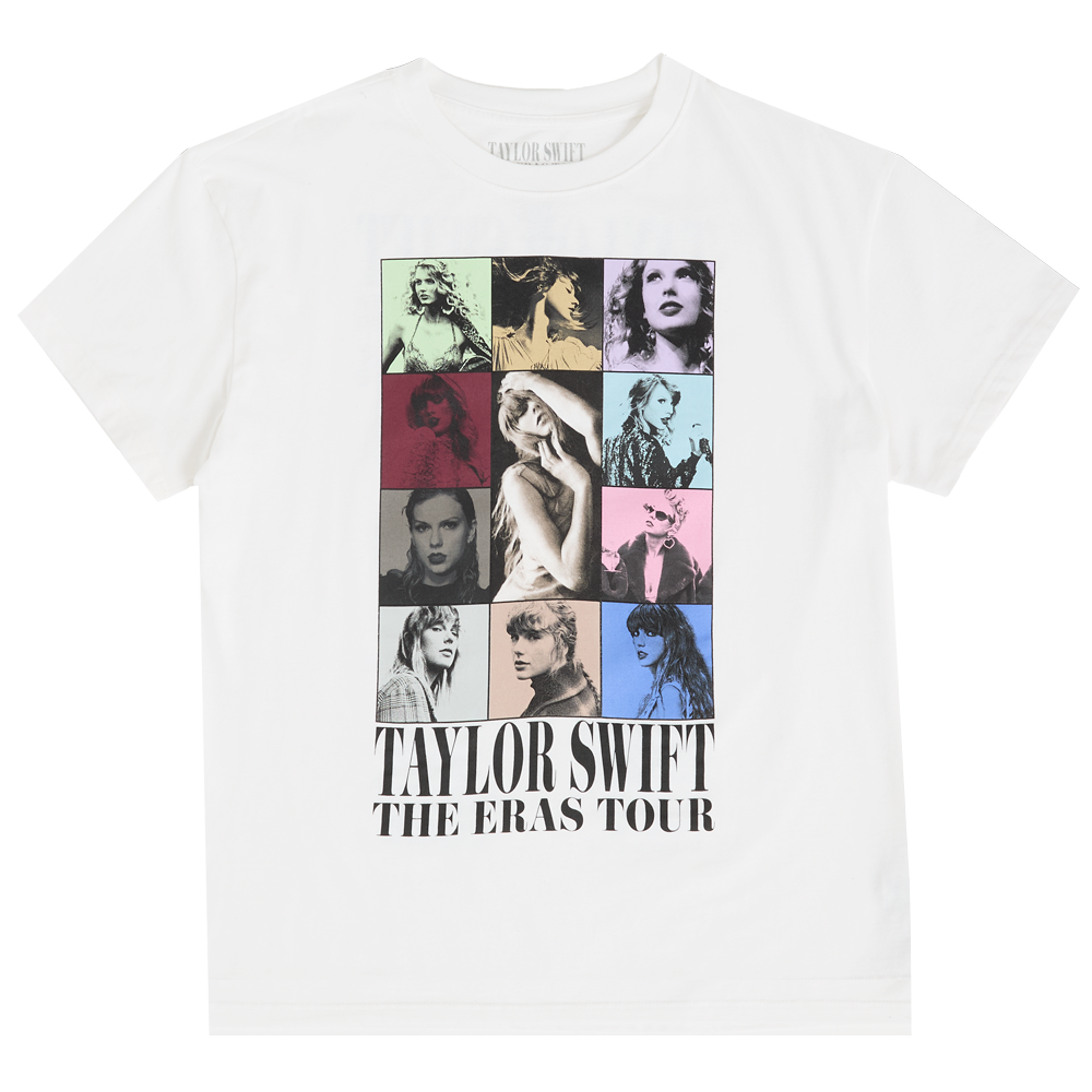 White t-shirt featuring photos of Taylor Swift and Taylor Swift The Eras Tour printed on front with Taylor Swift The Eras Tour 2023 – 2024 and tour locations through Vancouver printed on back.
