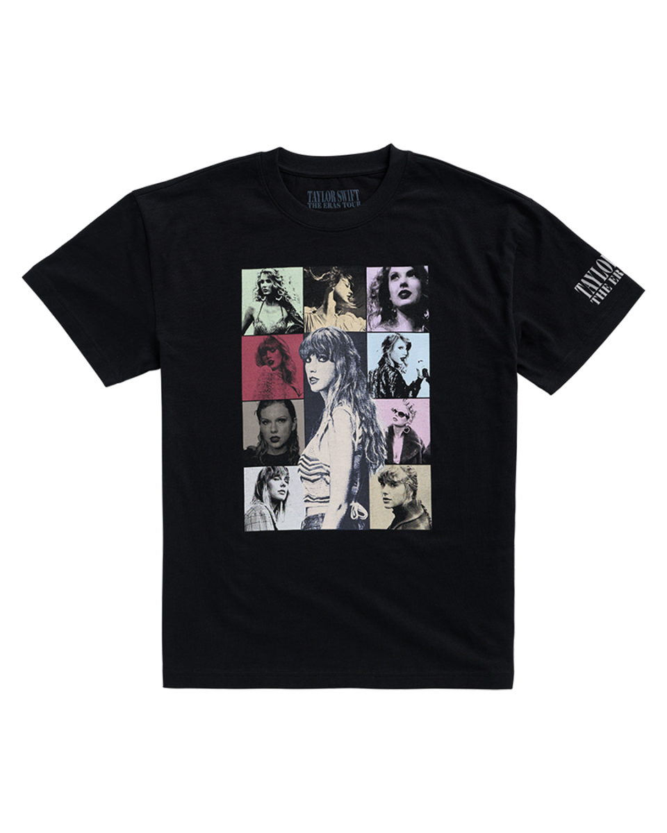 White crewneck featuring Taylor Swift The Eras Tour printed on front and photos of Taylor Swift printed on back.