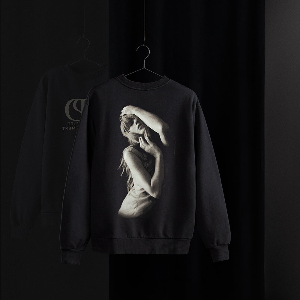 Ink black crewneck featuring gray TTPD album logo and The Tortured Poets Department printed on front and photo of Taylor Swift printed on back.