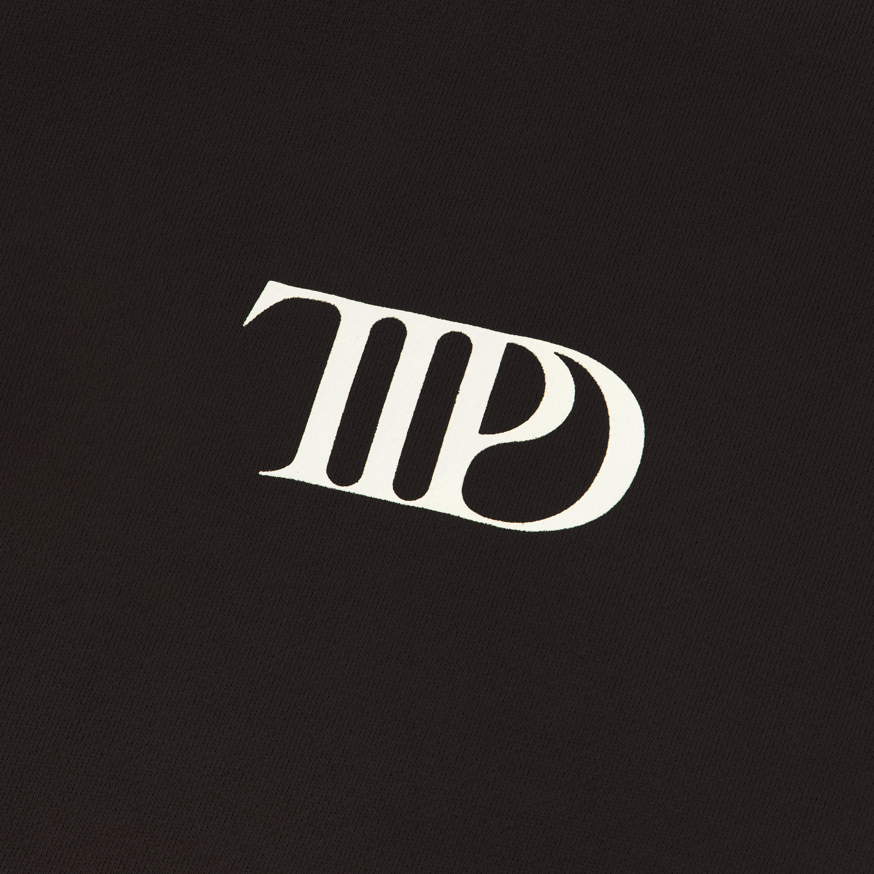 Dark brown hoodie with front pocket featuring TTPD album logo printed on front and photo of Taylor Swift. Who’s Afraid Of Little Old Me? song lyrics. You Should Be song lyrics and The Tortured Poets Department in box design printed on back.